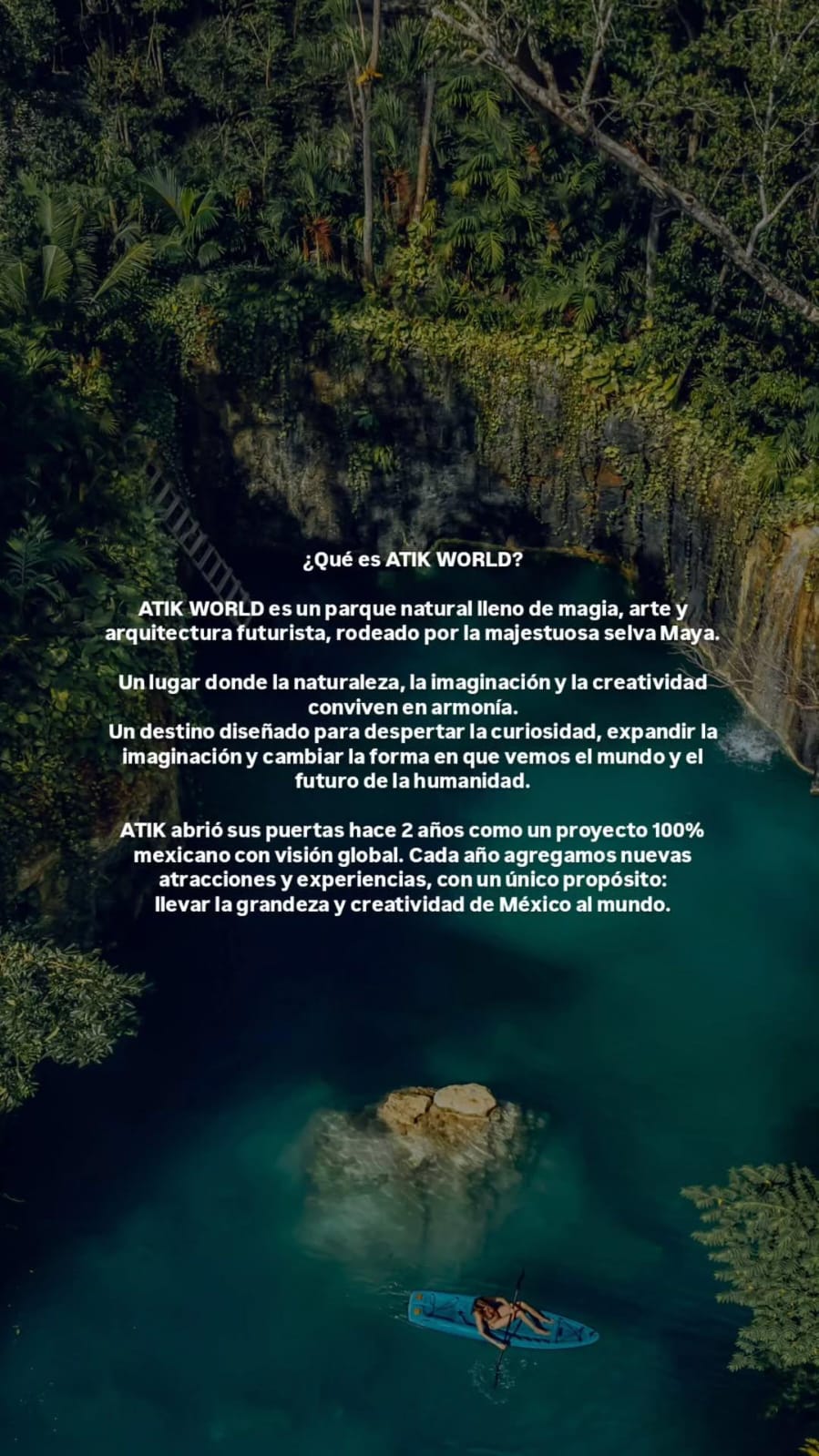 ATIK WORLD es un parque natural lleno de magia, arte y arquitectura futurista, rodeado por la majestuosa selva Maya. Un lugar donde la naturaleza, la imaginación y la creatividad conviven en armonía. Un destino diseñado para despertar la curiosidad, expandir la imaginación y transformar la forma en que vemos el mundo y el futuro de la humanidad.